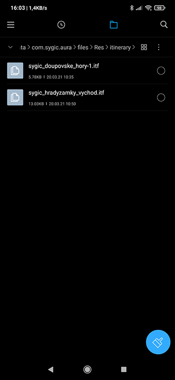 Sygic je jednou z nejrozšířenějších navigačních aplikací pro mobilní telefony s operačním systémem Android. Proto si ukážeme, jak použít náš zdroj v této navigaci. Předem je potřeba předeslat, že tato aplikace používá odlišný formát souborů než Garmin nebo TomTom. Zdroj si můžete stáhnout buď v zipu přes QR kód nebo nezabalený tlačítkem pod QR kódem. Prvním předpokladem je, že máte v mobilu nainstalovanou aplikaci Sygic. Dalším krokem je stažení souboru s trasou podle výše popsaného postupu. Stahované soubory se defaultně ukládají do složky Downloads, a to buď do interní paměti přístroje nebo na paměťovou kartu. Najdeme uložený soubor s koncovkou itf (pokud jste stáhli zip přes QR kód, budete ho muset nejdříve rozbalit) a zkopírujeme soubor do složky paměť.medium / Adndroid / data / com.sygic.aura / files / Res / itinerary (paměť.medium zvolte podle toho kam máte sygic nainstalován, defaultně to bývá interní paměť zařízení).