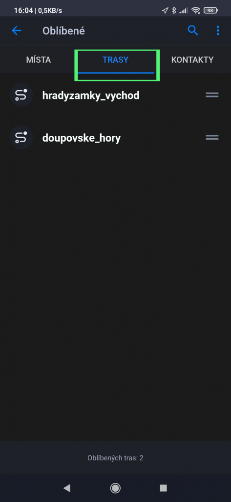 V nabídce zvolte položku TRASY, pokud jste postupovali správně uvidíte nahrané nebo uložené trasy.